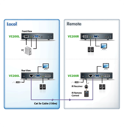 Isto acontece por meio de uma unidade de transmissão local (VE200L) e uma unidade remota (VE200R), conectadas por um par de cabos Cat 5e trançados.